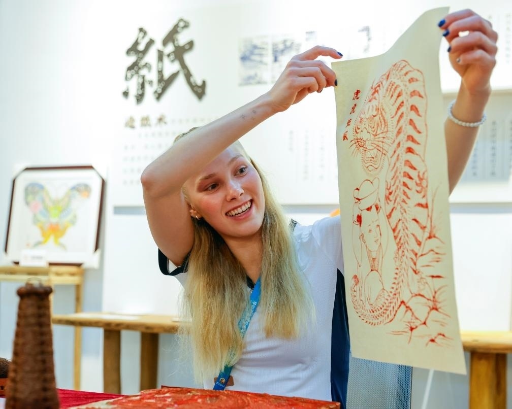 8月3日,在成都大運村的互動體驗中心,芬蘭運動員杰茜卡·卡哈拉展示自己制作的夾江年畫。新華社記者 沈伯韓 攝