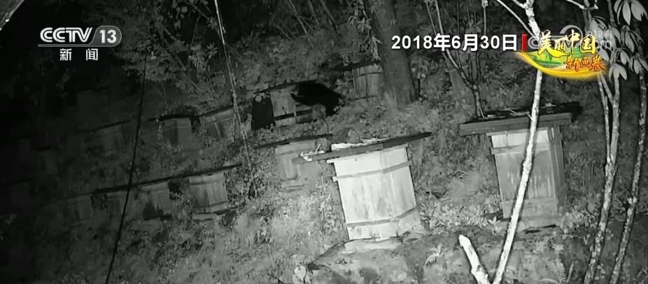 在湖北堵河源國家級(jí)自然保護(hù)區(qū),經(jīng)常會(huì)發(fā)生黑熊下山偷食百姓的莊稼、蜂蜜等農(nóng)產(chǎn)品。記者通過當(dāng)?shù)匾晃淮迕裉峁┑囊曨l看到,2018年晚上一頭成年黑熊來到一蜂箱放置點(diǎn),黑熊為了取食蜂蜜推倒了一箱蜂箱,并啃食了幾口蜂蜜。