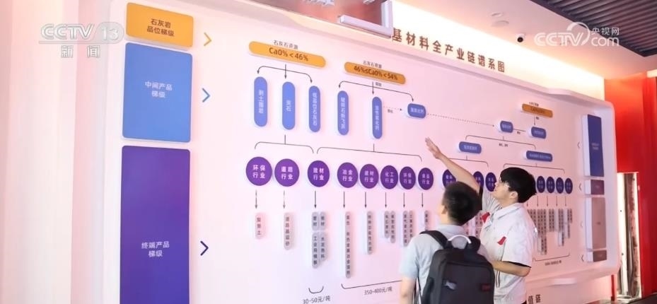 在企業(yè)展廳里,工作人員把記者引向一張產(chǎn)業(yè)鏈譜系圖。最基礎(chǔ)的石灰石,既可以是水泥的生產(chǎn)原料,還可以根據(jù)石頭的鈣含量和加工深度,延伸出氧化鈣、碳酸鈣、納米鈣等各種各樣的下游產(chǎn)品,用于食品、醫(yī)藥、電子等領(lǐng)域。產(chǎn)品鏈條每往下延伸一步,價格就要翻上幾倍。