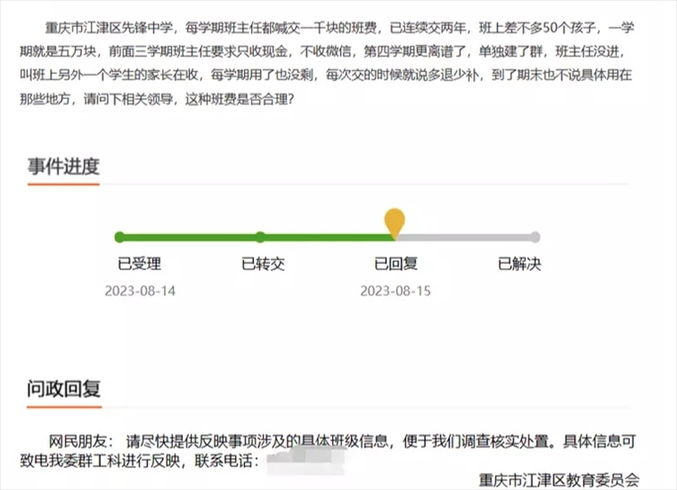 ·重慶江津某中學(xué)一班級(jí)收5萬(wàn)元班費(fèi),每人一學(xué)期交1000元。區(qū)教委:已啟動(dòng)調(diào)查程序,督促學(xué)校自查。