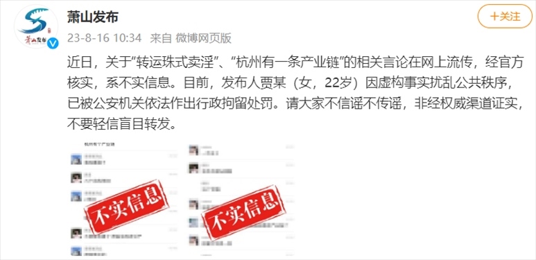 ·杭州蕭山辟謠“轉(zhuǎn)運(yùn)珠式賣淫”:發(fā)布人已被行政拘留。