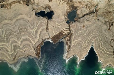 日漸干涸的死海。自1960年以來,死海已經(jīng)失去了三分之一的表面積,藍(lán)色的海水每年后退約一米。