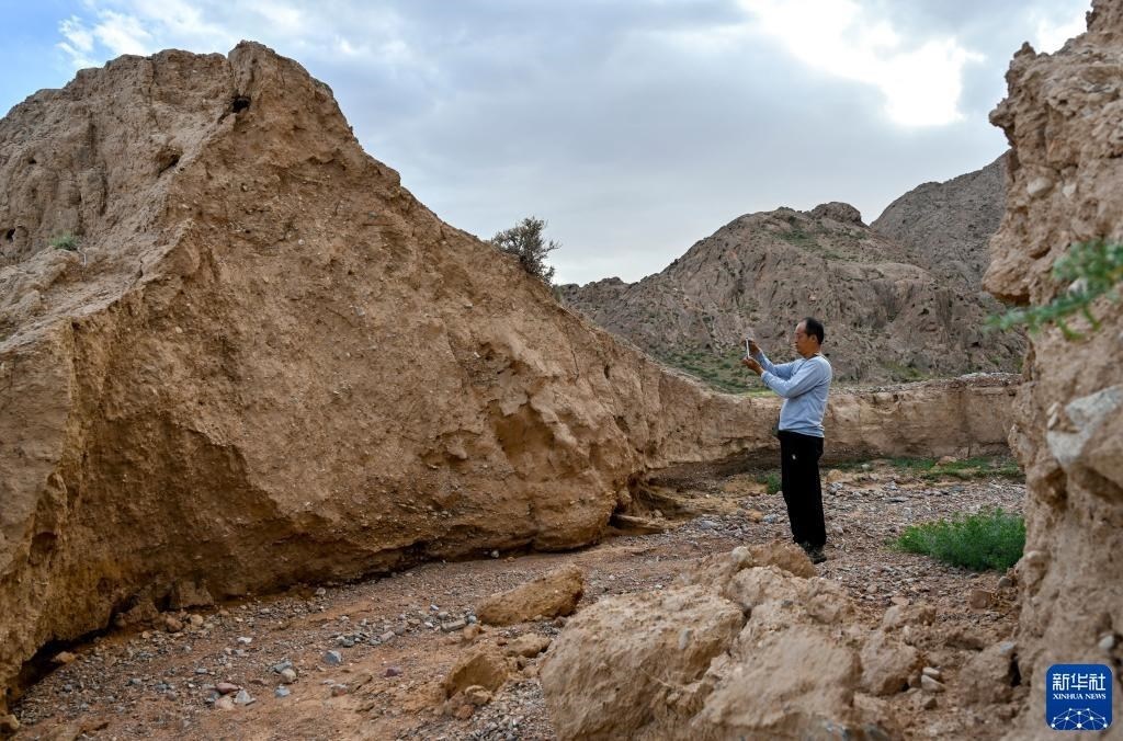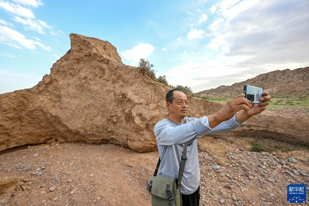 8月20日,董海寧巡查賀蘭山沿線(xiàn)的明長(zhǎng)城永寧段時(shí)用手機(jī)拍照記錄。新華社記者 連振 攝