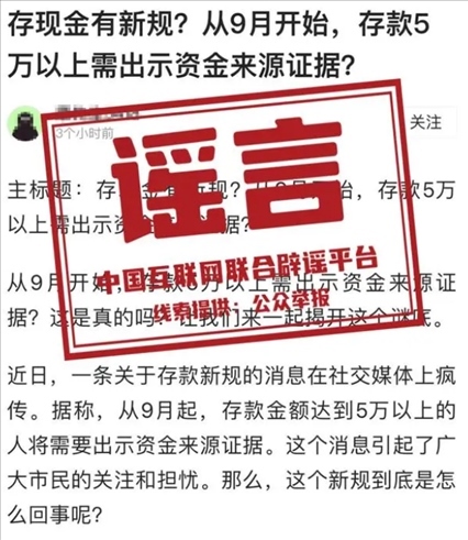 ·9月起所有大額存款須出示特定證明材料?央行辟謠:不實(shí)信息。