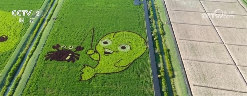 在崇明橫沙島,占地120畝的稻田畫也迎來了四方游客。稻田采用兒童畫的手法,以橘子、枇杷、車?yán)遄?、“三棵樹”為主題,展示生態(tài)發(fā)展成果。在“三棵樹”旁,一只小江豚正歡快地在江中釣著螃蟹,畫面靈動(dòng)有趣。另一邊,籃球場(chǎng)和運(yùn)動(dòng)員的圖案則展現(xiàn)了運(yùn)動(dòng)健兒們?cè)谫悎?chǎng)上奮力拼搏的健美身姿。