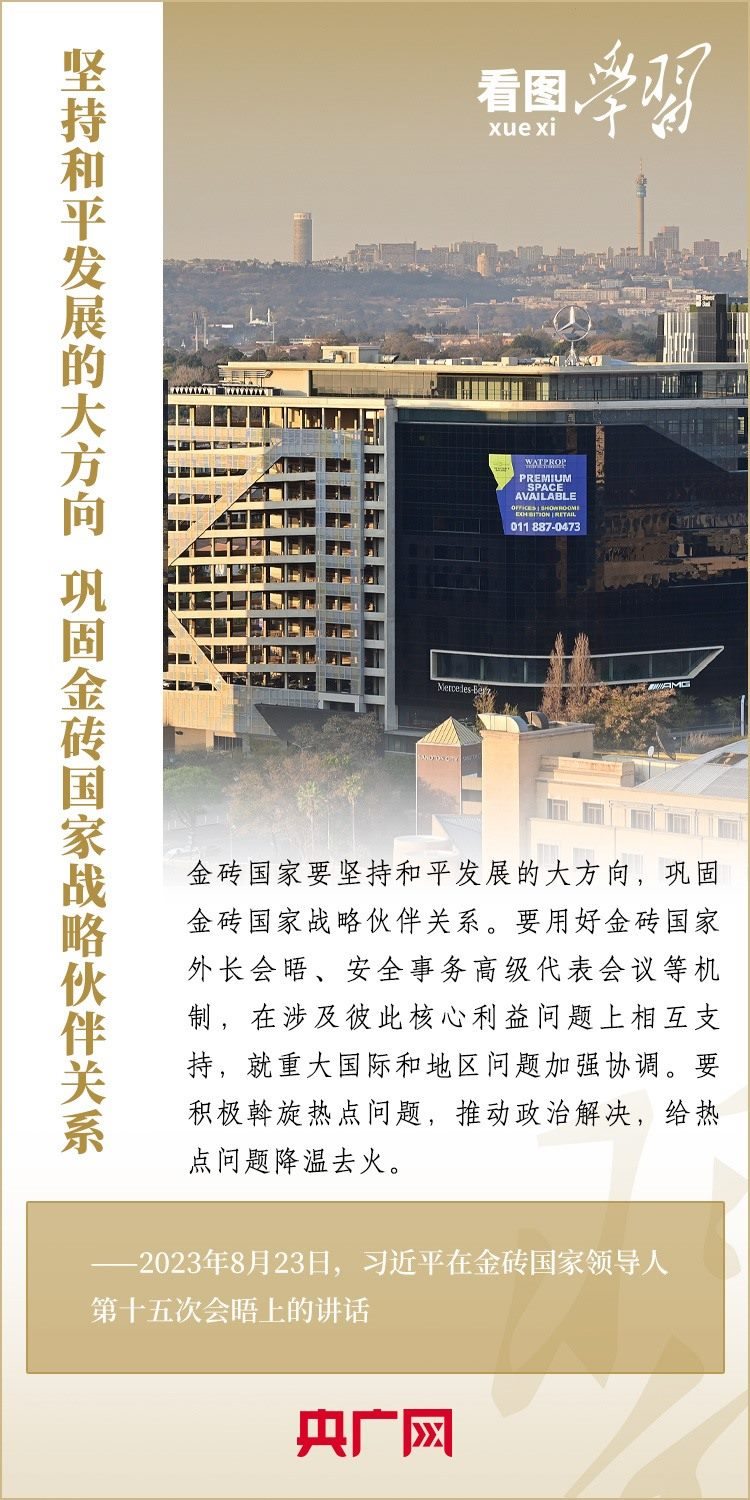 當(dāng)?shù)貢r(shí)間8月23日,習(xí)近平主席出席金磚國(guó)家領(lǐng)導(dǎo)人第十五次會(huì)晤并發(fā)表重要講話,強(qiáng)調(diào)金磚國(guó)家要秉持開(kāi)放包容、合作共贏的金磚精神,以金磚責(zé)任應(yīng)對(duì)共同挑戰(zhàn),以金磚擔(dān)當(dāng)開(kāi)創(chuàng)美好未來(lái)。一起來(lái)學(xué)習(xí)!