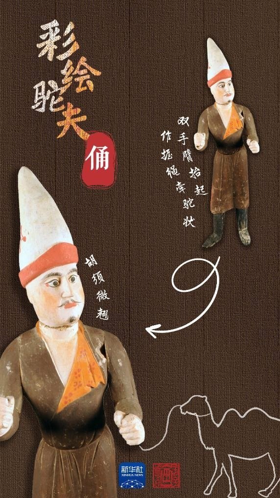 吐魯番阿斯塔那206號墓是唐代高昌左衛(wèi)大將軍張雄與妻子的合葬墓。墓中出土的木俑做工精湛,大多是由中原生產(chǎn),具有明顯的盛唐風格,彩繪駝夫俑便出土于此。駝夫為胡人男子形象,深目高鼻,胡須微翹,頭戴高聳折沿白氈尖帽,身著褐色掩襟長袍,足穿高棱黑靴。此俑為分段雕刻膠合而成,再施以彩繪,面部表情富有神韻,惟妙惟肖。通過駝夫生動的神情仿佛看到他牽著駱駝,帶著各色商品,沿著絲綢之路慢慢走來。