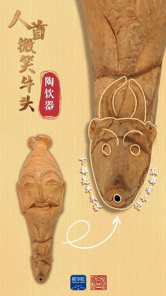 當中國絲綢的美譽經(jīng)由古絲綢之路在西亞、歐洲等地傳揚時,西方文明也穿過風沙與長歌,在中國留下了印記。人首微笑牛頭陶飲器出土于和田地區(qū)約特干遺址,為唐代時期文物。飲器上部為人首形,下部是牛頭狀,底部帶小圓孔,上下兩部分內腔相通。人首上唇胡須外展卷翹,面帶微笑。牛頭微微上翹,牛角豎立攏圓。這種飲器造型源自“來通”,即末端為動物形或人首形的角杯,是小亞細亞和地中海地區(qū)常見的飲酒器具,絲綢之路沿線國家都有類似文物出土。