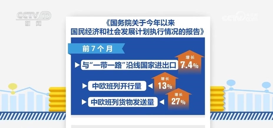 報告顯示,共建“一帶一路”持續(xù)推進。鞏固拓展與重點共建國家和國際組織的務實合作,進一步強化風險防控,前7個月與“一帶一路”沿線國家進出口增長7.4%,中歐班列開行量、貨物發(fā)送量分別增長13%、27%。