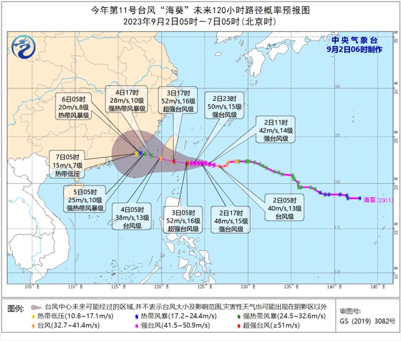 大風(fēng)預(yù)報:9月2日08時至3日08時,受“蘇拉”影響,南海西北部、北部灣東部、瓊州海峽及廣東沿海、廣西南部沿海、珠江口以及香港和澳門等地將有7-9級、陣風(fēng)10-11級的大風(fēng),“蘇拉”中心經(jīng)過的附近海面或地區(qū)風(fēng)力有12-13級、陣風(fēng)14-15級;受“海葵”影響,臺灣海峽、浙江南部沿海、福建沿海、廣東東部沿海、臺灣島沿海將有6-7級,陣風(fēng)8級大風(fēng),臺灣以東洋面部分海域風(fēng)力可達(dá)8-10級,陣風(fēng)11-12級,“??敝行慕?jīng)過的附近海面風(fēng)力可達(dá)12-13級,陣風(fēng)14級。