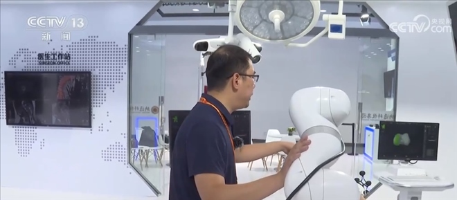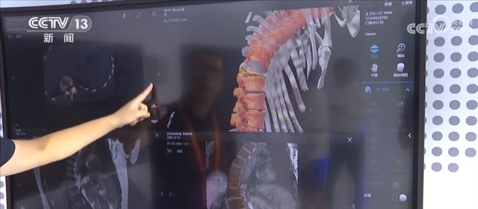 總臺記者 王豐:這里主要呈現(xiàn)的是一個智能手術(shù)室的系統(tǒng),這是一套幫助醫(yī)生進(jìn)行精準(zhǔn)手術(shù)計劃的設(shè)備,比如說我們可以利用一張X光片,一張CT或者一張核磁影像,就可以還原出一個3D的影像,醫(yī)生通過3D的建模,可以精準(zhǔn)地看到病灶所在的位置,包括他如何下刀,來精準(zhǔn)地制定手術(shù)計劃。