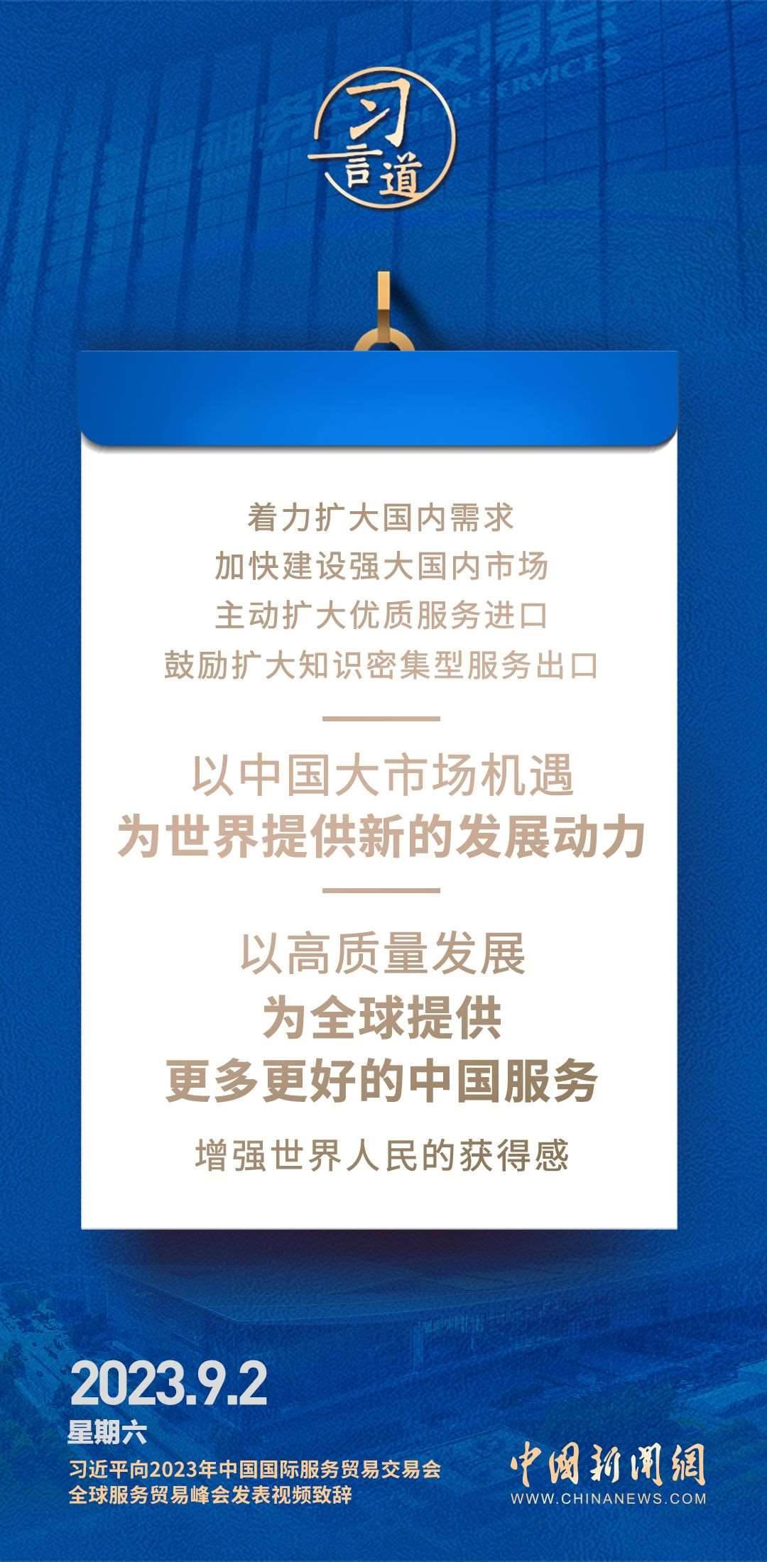 9月2日上午,國家主席習(xí)近平在北京向2023年中國國際服務(wù)貿(mào)易交易會(huì)全球服務(wù)貿(mào)易峰會(huì)發(fā)表視頻致辭。習(xí)近平指出——