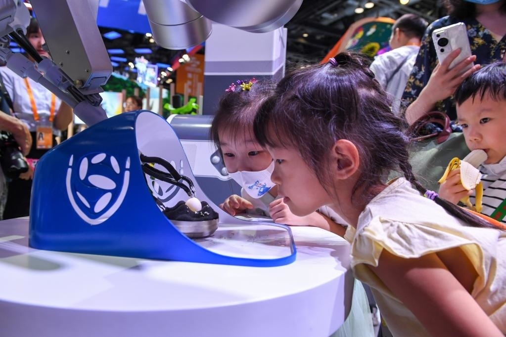9月3日,幾名小朋友在國家會議中心觀看單孔腔鏡手術(shù)機(jī)器人展示。新華社記者 鞠煥宗 攝