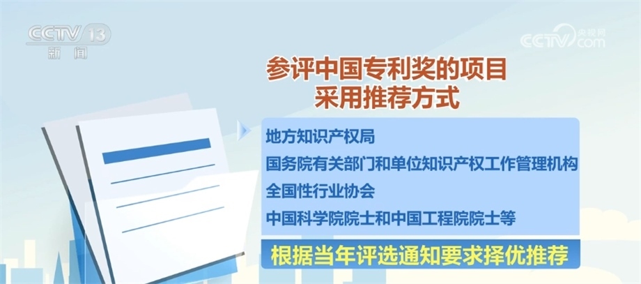 參評(píng)中國(guó)專利獎(jiǎng)的項(xiàng)目采用推薦方式,由地方知識(shí)產(chǎn)權(quán)局、國(guó)務(wù)院有關(guān)部門和單位知識(shí)產(chǎn)權(quán)工作管理機(jī)構(gòu)、全國(guó)性行業(yè)協(xié)會(huì)、中國(guó)科學(xué)院院士和中國(guó)工程院院士等根據(jù)當(dāng)年評(píng)選通知要求擇優(yōu)推薦。經(jīng)過(guò)評(píng)審之后,在國(guó)家知識(shí)產(chǎn)權(quán)局政府網(wǎng)站公示評(píng)選結(jié)果,接受社會(huì)監(jiān)督。