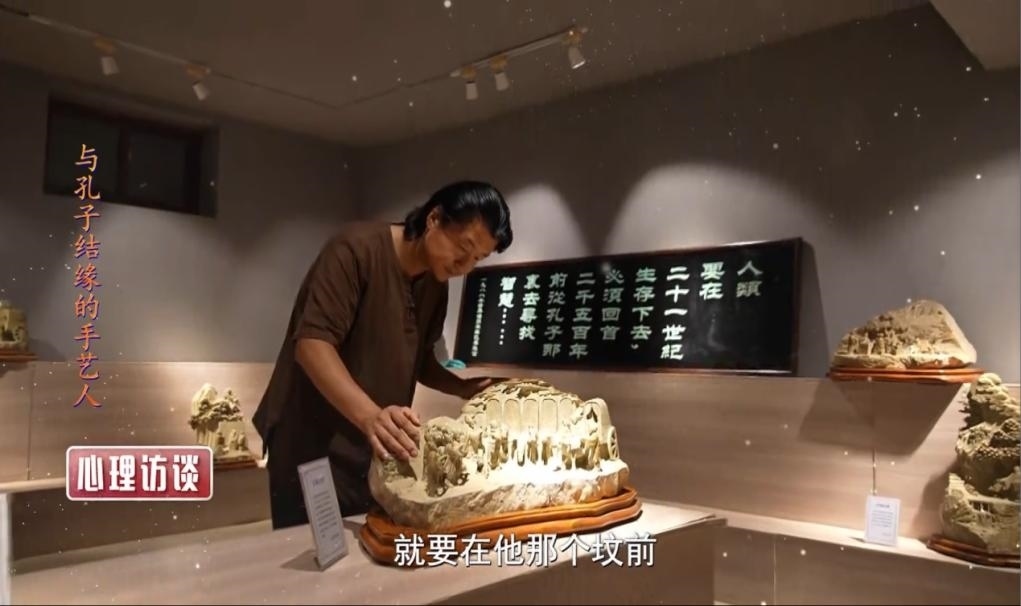尼山是孔子的故鄉(xiāng),用尼山石雕刻孔子的一生,意義深遠(yuǎn)。杜慶收根據(jù)每塊尼山石的形狀、紋路,確定要雕刻的內(nèi)容。每塊尼山石重達(dá)一兩百斤,雕刻一個(gè)故事需要一兩個(gè)月左右。杜慶收常常在晨曦中開始雕刻,在月光中結(jié)束一天的工作。精雕細(xì)琢中,杜慶收也一遍遍揣摩孔子的內(nèi)心。曾經(jīng)意氣風(fēng)發(fā)的孔子,曾經(jīng)郁郁不得志的孔子,曾經(jīng)灑脫的孔子,曾經(jīng)被稱為“喪家之犬”的孔子,杜慶收每次都將自己代入其中。他最喜歡的是孔子與弟子走散,被人稱為“喪家之犬”的故事,這個(gè)故事也激勵(lì)著他,無(wú)論遇到什么樣的困難,都要堅(jiān)定地走下去,完成心中的夢(mèng)想。為了完成這106件作品,杜慶收放下了其他的工作,全身心投入其中,并賣掉了自己唯一的房子,最終經(jīng)過九年的時(shí)間,終于完成了全部作品。