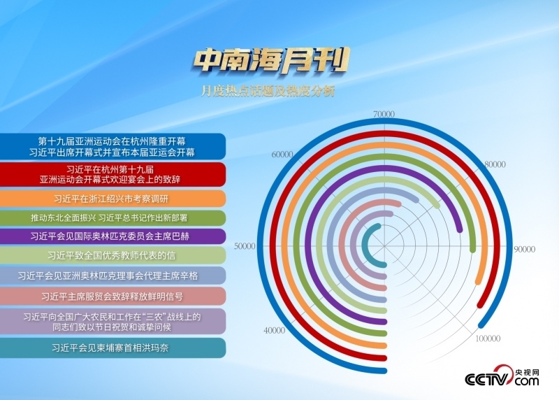 9月23日,在寓意豐收和團(tuán)圓的秋分時(shí)節(jié),亞運(yùn)之光映照神州大地,亞運(yùn)之火點(diǎn)燃國(guó)人激情,綻放出健康中國(guó)的生動(dòng)場(chǎng)景。中國(guó)以真摯的熱情歡迎亞洲體育健兒和國(guó)際貴賓,定格下四海賓朋如約而至的“杭州時(shí)刻”。央視網(wǎng)“智聞”系統(tǒng)提取分析的9月全網(wǎng)時(shí)政新聞熱點(diǎn)中,習(xí)近平主席在杭州亞運(yùn)會(huì)期間的外交活動(dòng)備受輿論關(guān)注。