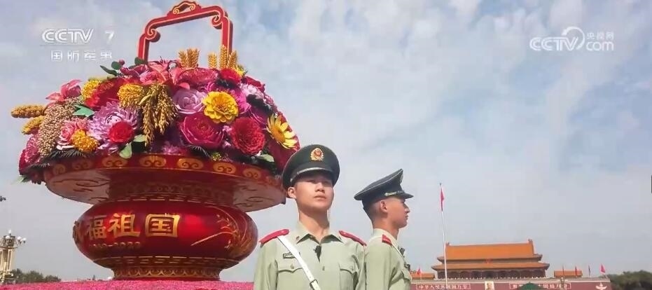 在北京,天安門廣場內(nèi)祝福祖國的巨型花籃吸引著眾多游客前來觀賞拍攝。武警官兵在完成好巡邏執(zhí)勤任務的同時,協(xié)助工作人員進行游客疏導也成為一項重要的工作。