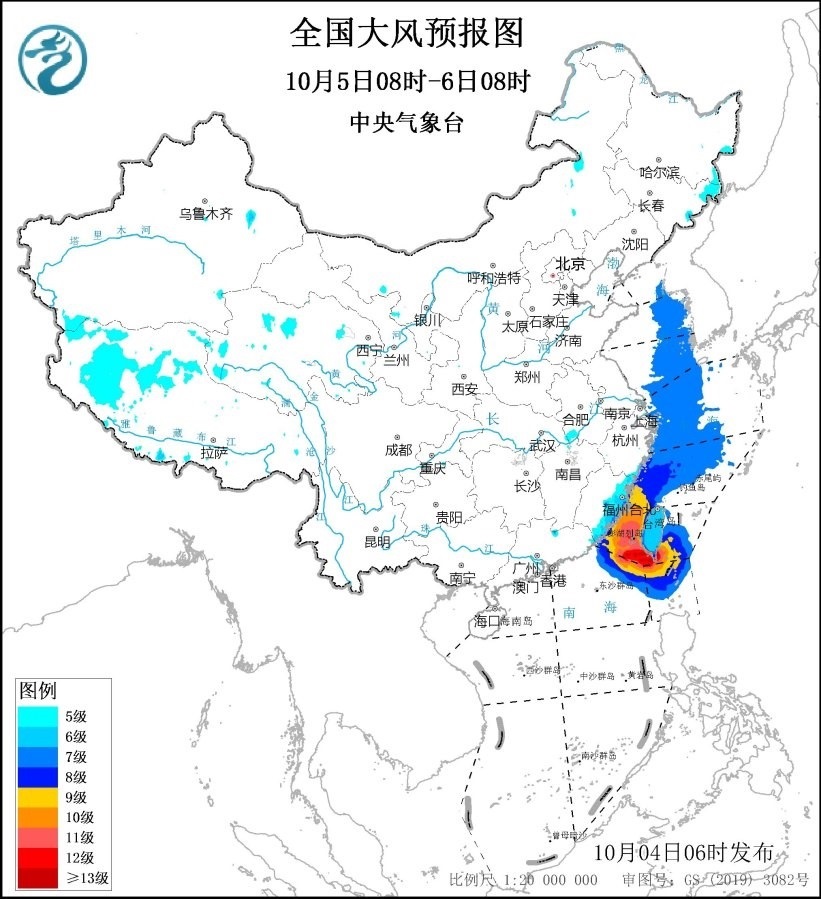 10月5日08時至6日08時,東海西南部海域、臺灣海峽、臺灣以東洋面、巴士海峽、南海東北部偏北海域?qū)⒂?~9級、陣風(fēng)10~11級的大風(fēng),其中臺灣海峽、臺灣以東洋面、巴士海峽的部分海域風(fēng)力可達(dá)10~12級、陣風(fēng)13~14級,臺風(fēng)“小犬”中心經(jīng)過的附近海域風(fēng)力可達(dá)13~14級、陣風(fēng)15~16級,黃海東部海域、東海西北部海域?qū)⒂?級、陣風(fēng)8級的大風(fēng);西藏西部將有5~6級、陣風(fēng)7級的大風(fēng),浙江沿海、福建沿海、臺灣島將有6~8級、陣風(fēng)9級的大風(fēng)。