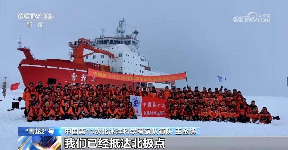 中國(guó)第13次北冰洋科學(xué)考察隊(duì)領(lǐng)隊(duì) 王金輝:中國(guó)第13次北冰洋科學(xué)考察隊(duì)隊(duì)員們,很高興地告訴大家,我們已經(jīng)抵達(dá)北極點(diǎn)。