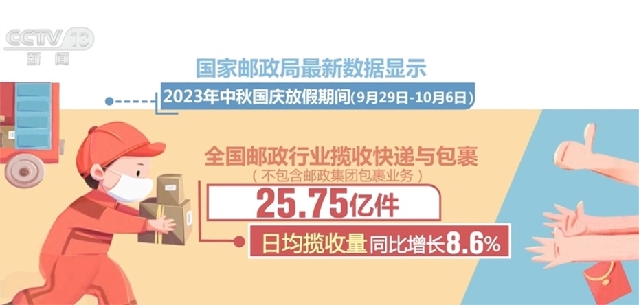 國家郵政局最新數據顯示,今年中秋國慶放假期間,全國郵政行業(yè)攬收快遞與包裹25.75億件,日均攬收量同比增長8.6%;投遞快遞與包裹25.72億件,日均投遞量同比增長18.7%。