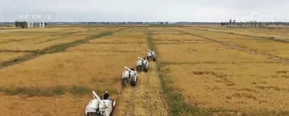 在農(nóng)安縣開(kāi)安鎮(zhèn)的稻田里,幾臺(tái)大型收割機(jī)編組作業(yè),往來(lái)穿梭在稻田里收割稻谷。