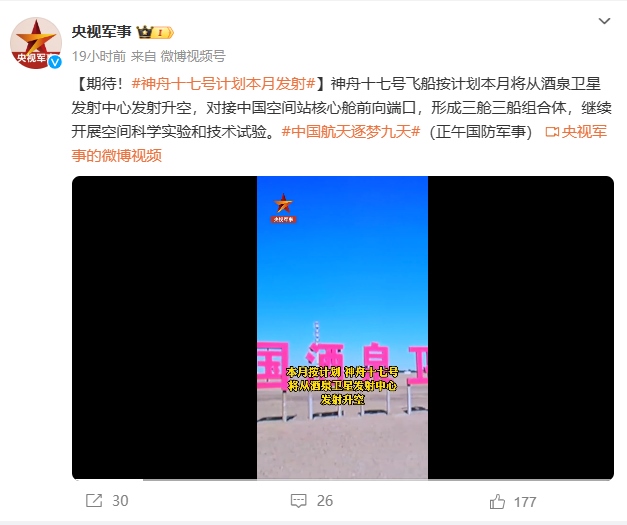 據(jù)“央視軍事”微博賬號(hào)報(bào)道 神舟十七號(hào)飛船按計(jì)劃本月(十月)將從酒泉衛(wèi)星發(fā)射中心發(fā)射升空,對(duì)接中國空間站核心艙前向端口,形成三艙三船組合體,繼續(xù)開展空間科學(xué)實(shí)驗(yàn)和技術(shù)試驗(yàn)。