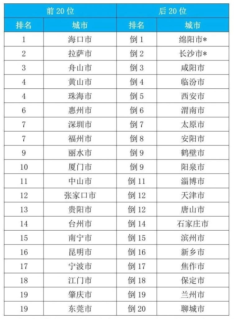 從重點城市排名看,1至9月,168個重點城市中,空氣質(zhì)量排名前20位城市依次是海口、拉薩和舟山等城市(從第1名至并列第19名);空氣質(zhì)量排名后20位城市依次是綿陽、長沙和咸陽等城市(從倒數(shù)第1名至倒數(shù)第20名)。據(jù)了解,綿陽市的一個監(jiān)測站點4月和5月、長沙市的一個監(jiān)測站點6月受到嚴(yán)重人為干擾,生態(tài)環(huán)境部對所在城市當(dāng)月六項污染物濃度進(jìn)行了最大值替代處理。(記者高敬)