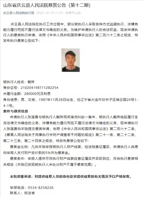 ·前國(guó)腳戴琳欠款28萬元,有能力而拒不履行被法院公開懸賞。