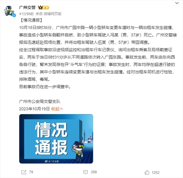 ·廣州交警通報(bào)寶馬車與出租車發(fā)生碰撞后撞上橋墩起火、駕駛?cè)怂劳鍪录簝绍嚲佟⑽窗l(fā)現(xiàn)開“斗氣車”。出租車所屬公司發(fā)聲:司機(jī)已盡力剎車,但確實(shí)存在超速。