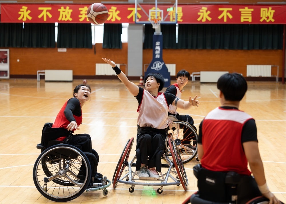 這是2023年8月31日,黃曉連(左二)在中國殘疾人體育運動管理中心訓(xùn)練。新華社記者 才揚 攝