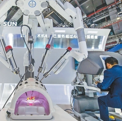 在醫(yī)療器械及醫(yī)藥保健展區(qū),參觀者正在體驗操作復星醫(yī)藥首臺國產(chǎn)“達芬奇Xi手術(shù)系統(tǒng)”。人民網(wǎng)記者 翁奇羽攝