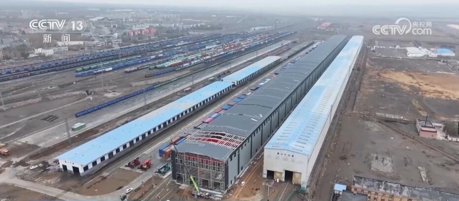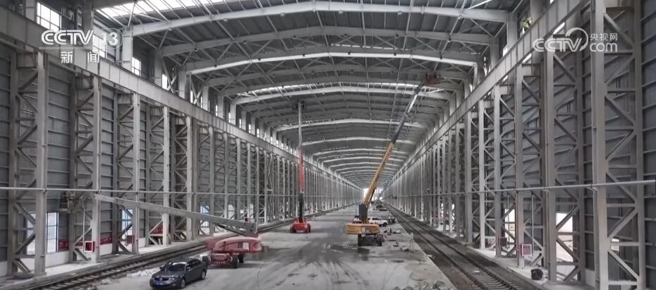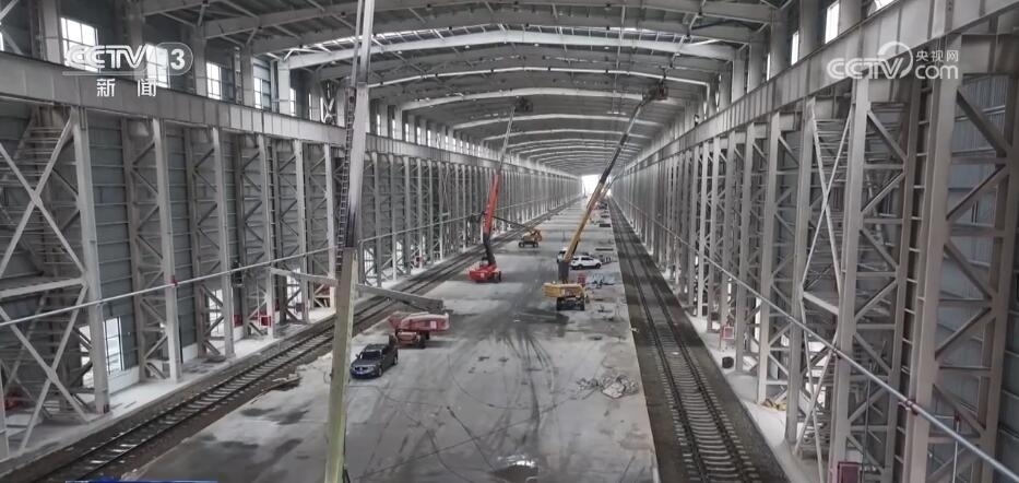 總臺記者 崔寧:在我的身后有一小一大、一舊一新兩座換裝庫,它們主要是對入境的中歐班列進(jìn)行換裝。小的這座看起來也比較舊,它建于2008年,到目前為止已經(jīng)投用了整整15年。隨著“一帶一路”倡議的不斷推進(jìn),現(xiàn)在經(jīng)阿拉山口口岸出入境的中歐班列數(shù)量已經(jīng)由最初月均3.5列增加到日均17列。所以,它的存在也已經(jīng)遠(yuǎn)遠(yuǎn)不能滿足現(xiàn)在發(fā)展的需求,也正因?yàn)槿绱耍谒呐赃呌中陆艘蛔蟮膿Q裝庫,它建成投用之后將取而代之成為目前亞洲最大的室內(nèi)集裝箱換裝庫。