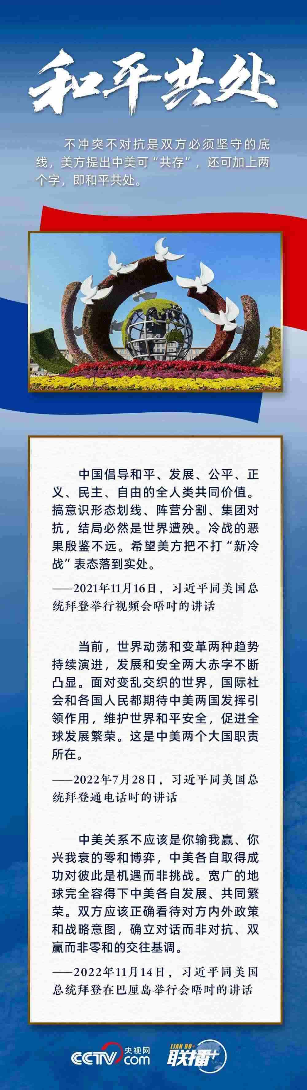 “中美不沖突、不對抗、和平共處,這是兩國最基本的共同利益?!绷?xí)主席指出,遵守國際關(guān)系基本準(zhǔn)則和中美三個聯(lián)合公報(bào),這是雙方管控矛盾分歧、防止對抗沖突的關(guān)鍵,也是中美關(guān)系最重要的防護(hù)和安全網(wǎng)。