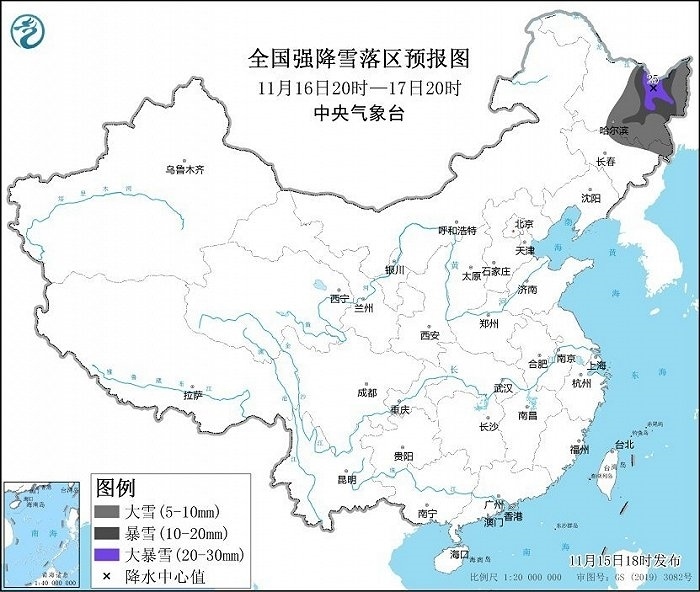 其中,11月15日20時(shí)至16日20時(shí),黑龍江中部、吉林東部等地部分地區(qū)有大雪,黑龍江中部局地有暴雪(10~12毫米),上述部分地區(qū)新增積雪深度3~5厘米,局地可達(dá)7厘米以上。16日20時(shí)至17日20時(shí),黑龍江中東部、吉林東北部等地部分地區(qū)有大雪,黑龍江東部部分地區(qū)有暴雪,局地大暴雪(20~25毫米),上述部分地區(qū)新增積雪深度5~10厘米,局地可達(dá)15厘米。