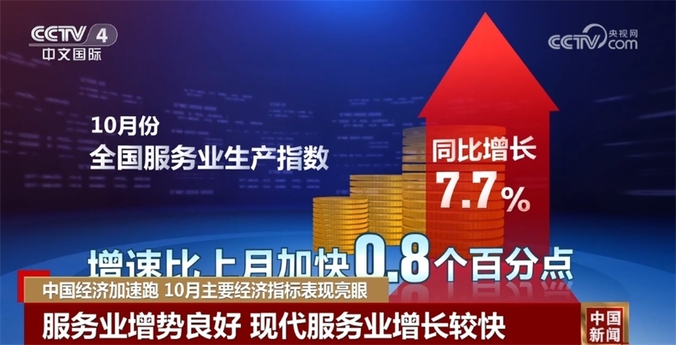 再來看服務(wù)業(yè)。服務(wù)業(yè)增勢良好,現(xiàn)代服務(wù)業(yè)增長較快。10月份,服務(wù)業(yè)生產(chǎn)指數(shù)同比增長7.7%,比上月加快0.8個(gè)百分點(diǎn)。其中,住宿和餐飲業(yè)、批發(fā)和零售業(yè)、交通運(yùn)輸倉儲(chǔ)和郵政業(yè)等聚集型服務(wù)業(yè)都保持兩位數(shù)增長。