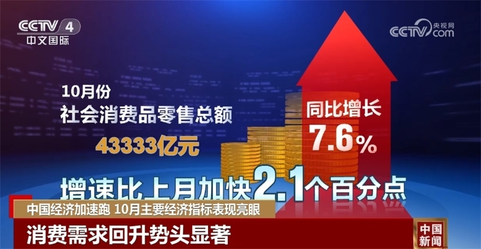 央視網(wǎng)消息:來關(guān)注中國經(jīng)濟(jì)10月報(bào)。國家統(tǒng)計(jì)局昨天(11月15日)發(fā)布了10月份經(jīng)濟(jì)主要指標(biāo)。數(shù)據(jù)顯示,隨著宏觀調(diào)控政策持續(xù)發(fā)力顯效,全國生產(chǎn)供給穩(wěn)中有升,市場需求持續(xù)改善,就業(yè)物價(jià)總體穩(wěn)定,高質(zhì)量發(fā)展扎實(shí)推進(jìn),國民經(jīng)濟(jì)持續(xù)恢復(fù)向好。
