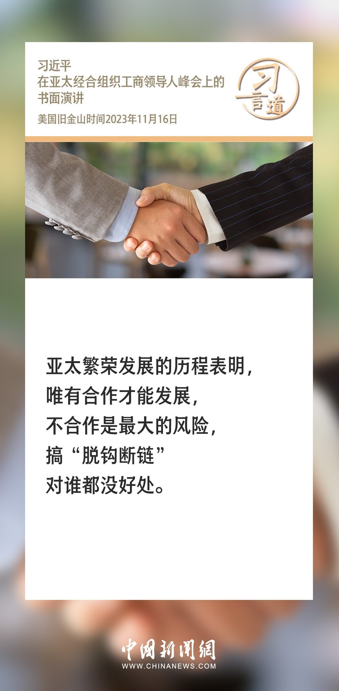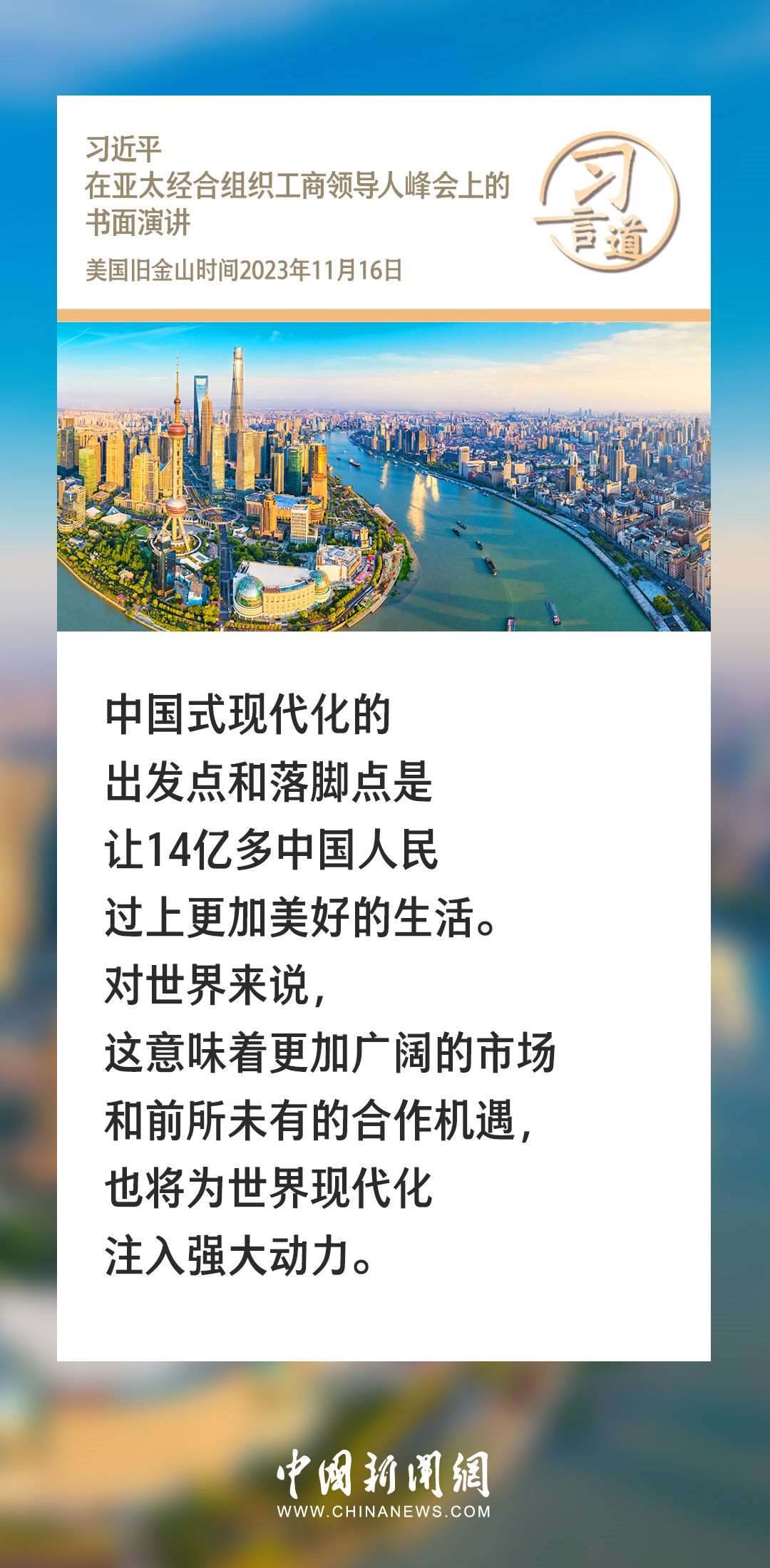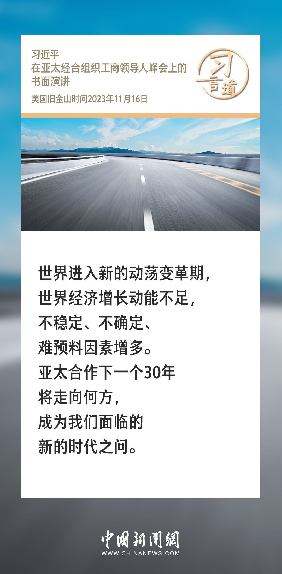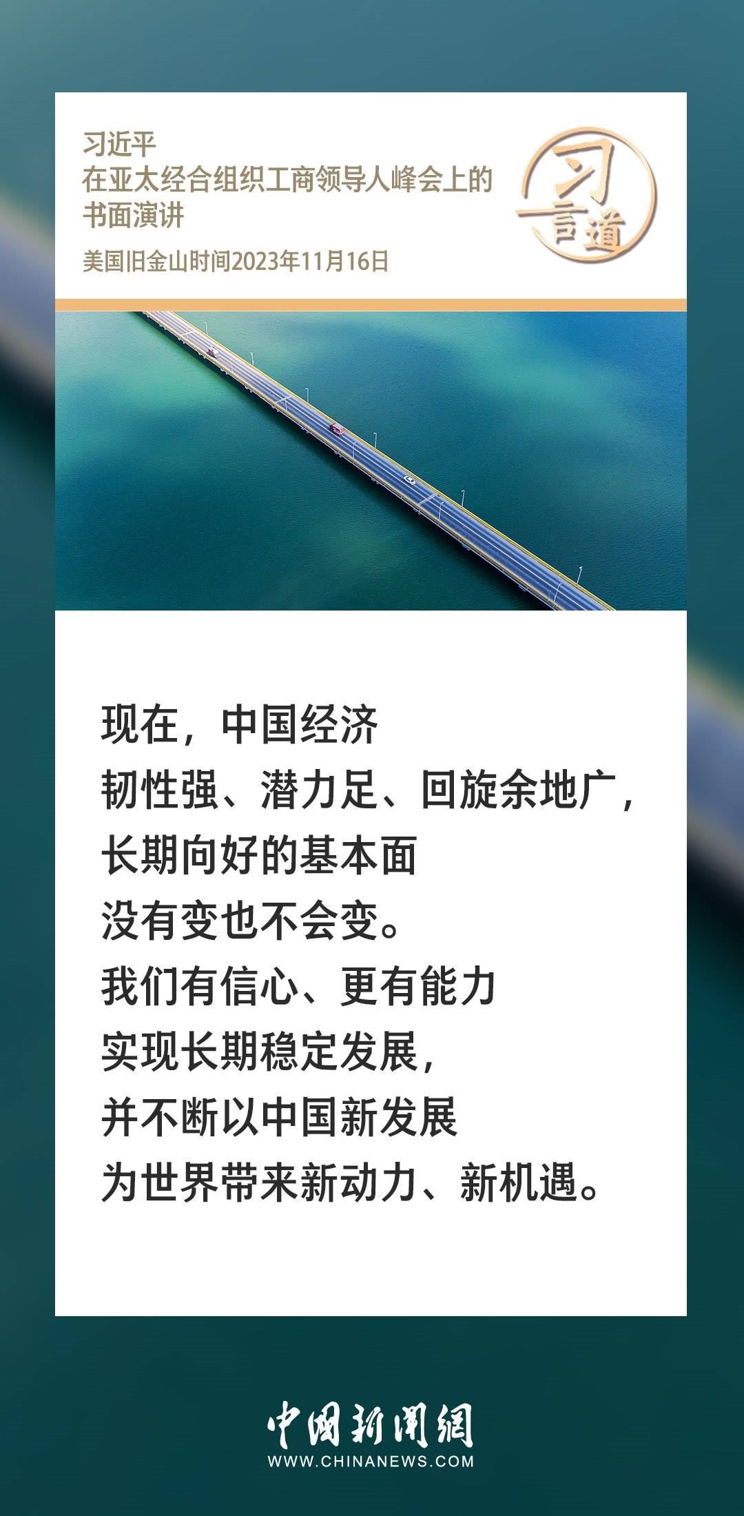 當?shù)貢r間11月16日上午,國家主席習(xí)近平向在舊金山舉行的亞太經(jīng)合組織工商領(lǐng)導(dǎo)人峰會發(fā)表題為《同心協(xié)力 共迎挑戰(zhàn) 譜寫亞太合作新篇章》的書面演講。習(xí)近平指出——