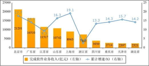 主要軟件大省收入占比持續(xù)提升。1—10月份,軟件業(yè)務(wù)收入居前5名的省份中,北京市、廣東省、江蘇省、山東省、上海市軟件收入分別為21201億元、16510億元、11517億元、10742億元和8963億元,分別增長(zhǎng)17.7%、14.1%、9.3%、16.3%和19.1%,五?。ㄊ校┖嫌?jì)軟件業(yè)務(wù)收入68933億元,占全國(guó)比重為70.2%,占比較去年同期提高1個(gè)百分點(diǎn)。