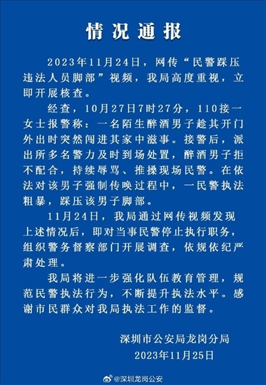 ·深圳龍崗警方通報“民警踩壓違法人員腳部”:依規(guī)依紀(jì)嚴(yán)肅處理。