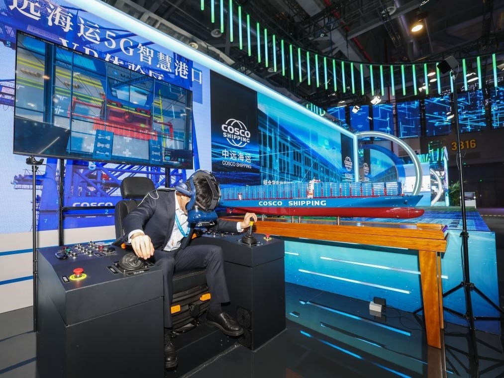 11月23日,在第二屆全球數(shù)字貿(mào)易博覽會(huì)上,工作人員戴上VR眼鏡,展示智慧港口遠(yuǎn)程操控吊車設(shè)備。新華社記者 徐昱 攝