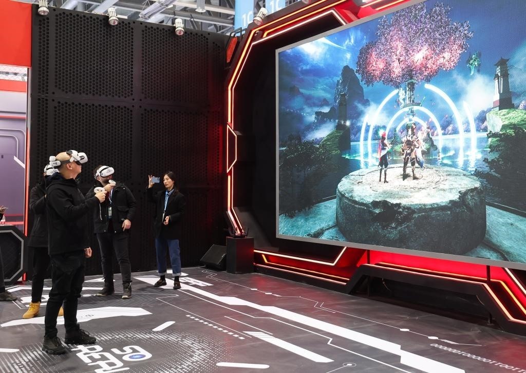 11月23日,在第二屆全球數(shù)字貿(mào)易博覽會(huì)上,參觀者戴上VR眼鏡體驗(yàn)虛擬游戲空間。新華社記者 徐昱 攝