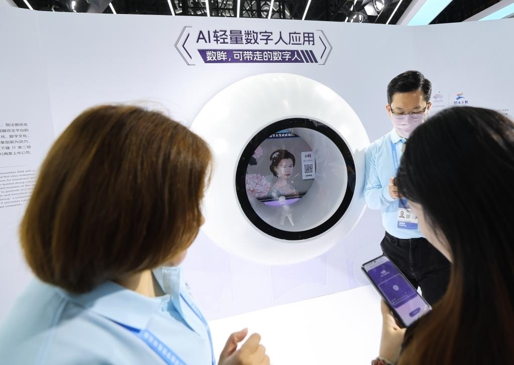 11月23日,參觀者在第二屆全球數(shù)字貿(mào)易博覽會(huì)上體驗(yàn)數(shù)字人應(yīng)用。新華社記者 徐昱 攝