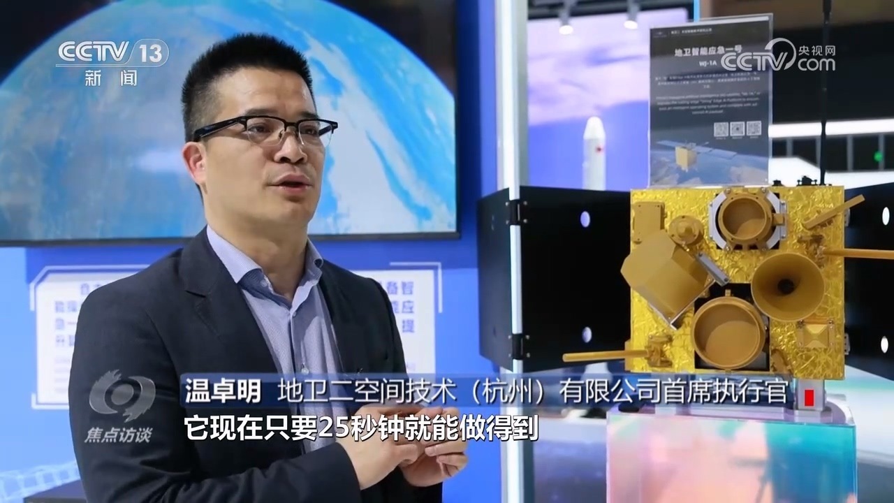 地衛(wèi)二空間技術(shù)(杭州)有限公司首席執(zhí)行官溫卓明:“這是一個(gè)聰明的衛(wèi)星,傳統(tǒng)的衛(wèi)星6個(gè)小時(shí)才能干完的事情,它只要25秒鐘就能做得到,而且原來可能要5000個(gè)工程師干的活,現(xiàn)在1個(gè)小時(shí)它就能做完。它是怎么能做到的?因?yàn)槲覀儼讶斯ぶ悄芊诺搅颂??!?/p>