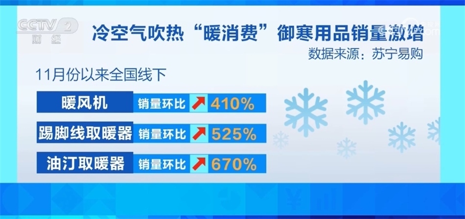?????? 數(shù)據(jù)顯示,11月份以來,某家電賣場全國線下暖風(fēng)機(jī)銷量環(huán)比增長410%,踢腳線取暖器銷量環(huán)比增長525%,油汀取暖器銷量環(huán)比增長670%。此外,某電商平臺上,暖鞋器、發(fā)熱圍脖、水暖毯、電暖桌等新型取暖設(shè)備的銷售額環(huán)比增長超過一倍。