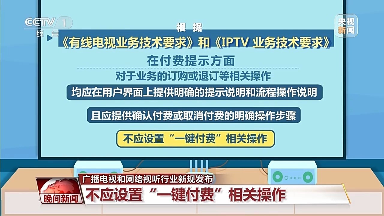 在付費(fèi)提示方面,對于業(yè)務(wù)的訂購或退訂等相關(guān)操作,均應(yīng)在用戶界面上,提供明確的提示說明和流程操作說明,且應(yīng)提供確認(rèn)付費(fèi)或取消付費(fèi)的明確操作步驟,不應(yīng)設(shè)置“一鍵付費(fèi)”相關(guān)操作。此外,有線電視和IPTV遙控器應(yīng)具備快捷看直播頻道的按鍵,通過此按鍵直接進(jìn)入全屏直播,按鍵名稱應(yīng)為“看電視”。