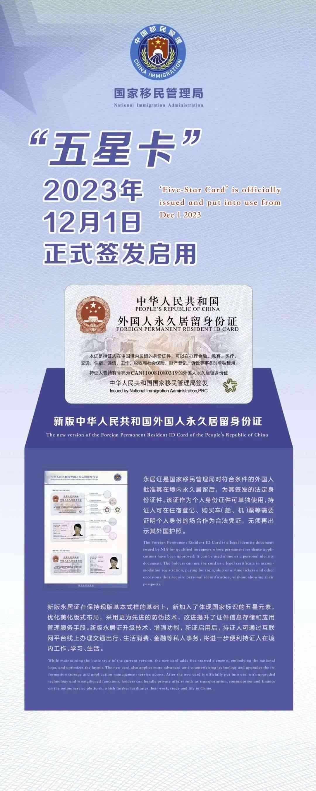 國(guó)家移民管理局相關(guān)負(fù)責(zé)人介紹,“五星卡”由國(guó)家移民管理局簽發(fā),是經(jīng)批準(zhǔn)在中國(guó)境內(nèi)永久居留外國(guó)人的法定身份證件。持證人可在需要證明個(gè)人身份的場(chǎng)合作為個(gè)人身份憑證單獨(dú)使用,無須再出示其外國(guó)護(hù)照?!拔逍强ā眱?yōu)化了證件信息存儲(chǔ)方式,美化了版式布局,采用了更為先進(jìn)的防偽技術(shù),增強(qiáng)了個(gè)人信息保護(hù)和數(shù)據(jù)安全性。國(guó)家移民管理局會(huì)同有關(guān)部門大力推進(jìn)各相關(guān)行業(yè)領(lǐng)域應(yīng)用系統(tǒng)、設(shè)施設(shè)備的適配性升級(jí)改造,便于持證人在交通出行、生活消費(fèi)、金融通信等公共服務(wù)、政務(wù)服務(wù)領(lǐng)域和互聯(lián)網(wǎng)平臺(tái)使用。