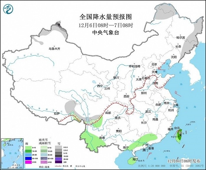 12月4日08時(shí)至5日08時(shí),新疆北部、甘肅河西、青海南部、西藏中東部和南部、川西高原北部等地部分地區(qū)有小到中雪或雨夾雪,其中,新疆阿勒泰山區(qū)和伊犁河谷、西藏南部等地部分地區(qū)有大到暴雪,局地大暴雪(20~22毫米)。湖南南部、江西南部、浙江大部、福建、廣東東部和北部、廣西西部、云南南部、海南島、臺(tái)灣島等地部分地區(qū)有小到中雨,其中,臺(tái)灣島中南部等地部分地區(qū)有大雨(25~40毫米)。新疆北疆北部、內(nèi)蒙古大部、甘肅河西等地部分地區(qū)有4~6級(jí)風(fēng)(見圖1)。