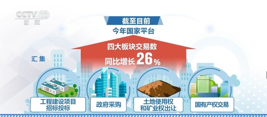 另外,全國公共資源交易平臺上的交易信息匯集發(fā)布量又創(chuàng)新高。截至目前,2023年國家平臺匯集工程建設(shè)項目招標(biāo)投標(biāo)、政府采購、土地使用權(quán)和礦業(yè)權(quán)出讓、國有產(chǎn)權(quán)交易這四大板塊交易數(shù)同比增長26%。