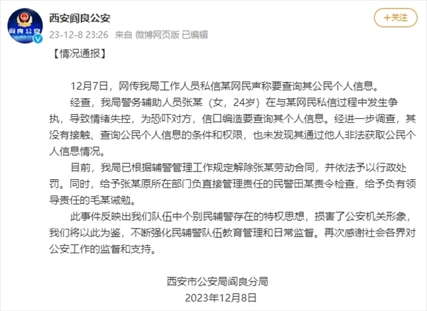 ·西安閻良公安通報(bào)警務(wù)輔助人員稱要查網(wǎng)友個(gè)人信息:解除勞動(dòng)合同,予以行政處罰。