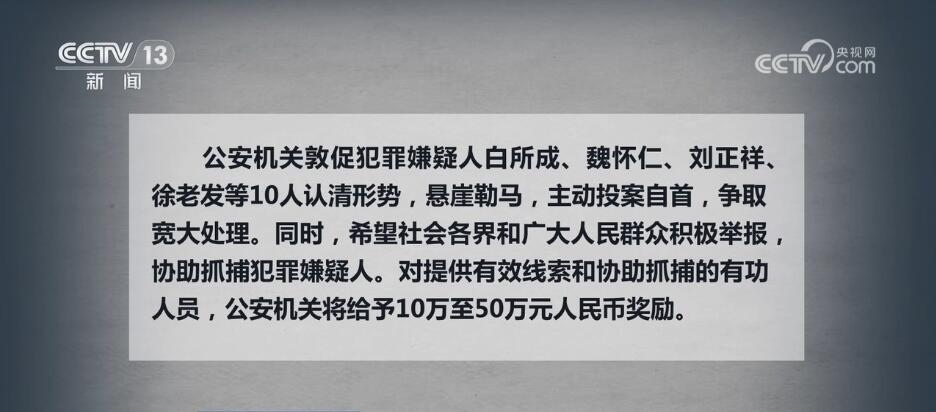 公安機關(guān)敦促犯罪嫌疑人白所成、魏懷仁、劉正祥、徐老發(fā)等10人認清形勢,懸崖勒馬,主動投案自首,爭取寬大處理。同時,希望社會各界和廣大人民群眾積極舉報,協(xié)助抓捕犯罪嫌疑人。對提供有效線索和協(xié)助抓捕的有功人員,公安機關(guān)將給予10萬至50萬元人民幣獎勵。